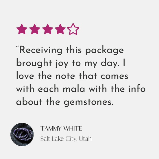 Keep your mālā dry, avoid harsh chemicals, and store it in a safe, sacred place to preserve its energy and quality. You can recharge it in the moonlight, smudge it with sage, or use a singing bowl for sound healing.