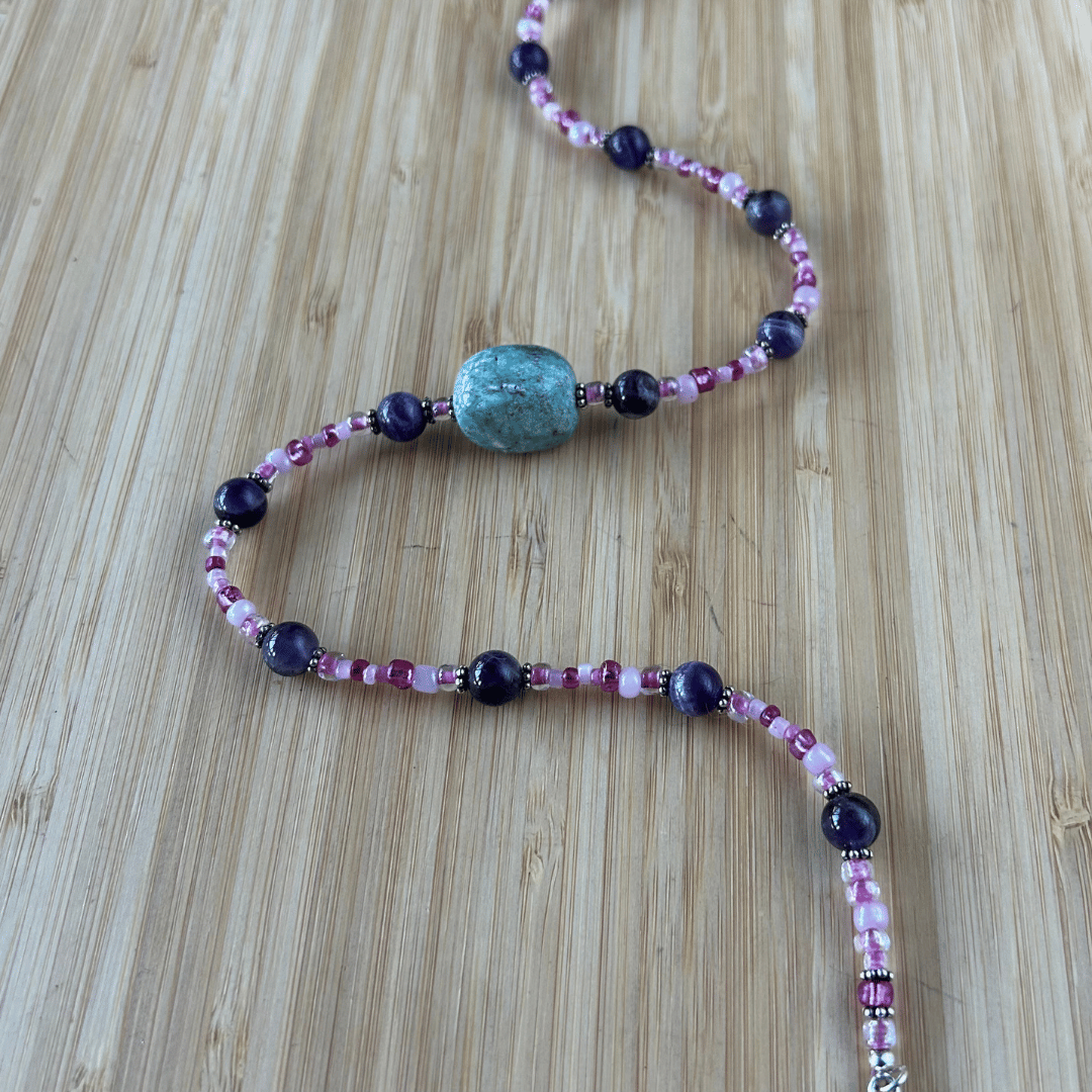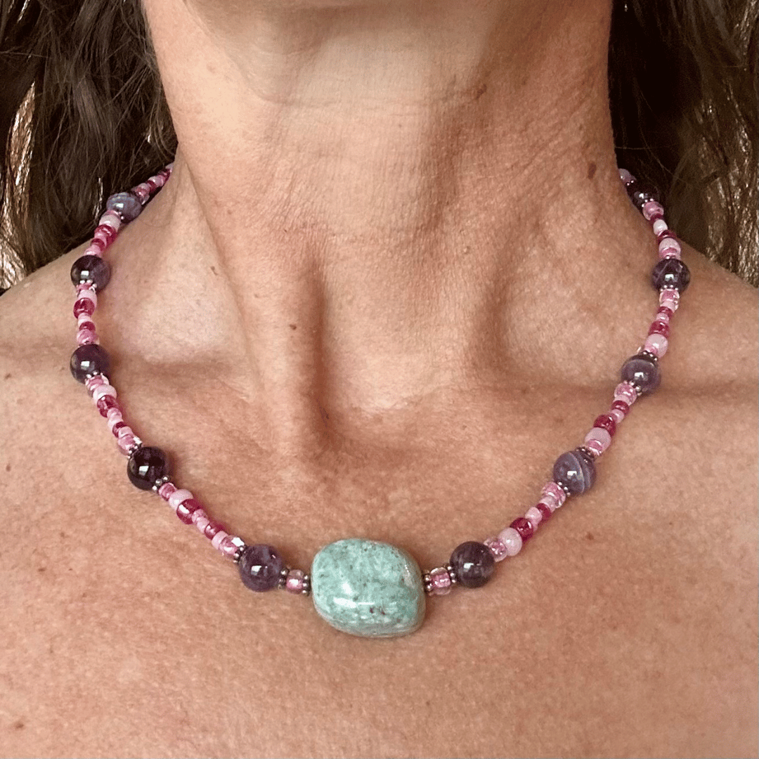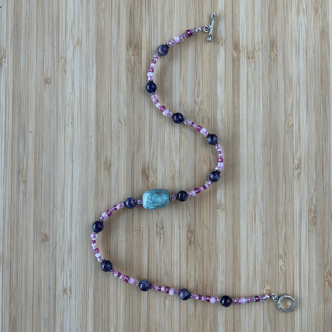 📿 Simply Strung Amethyst, Colored Glass, Amazonite Pendant, Silver Plated Clasp
