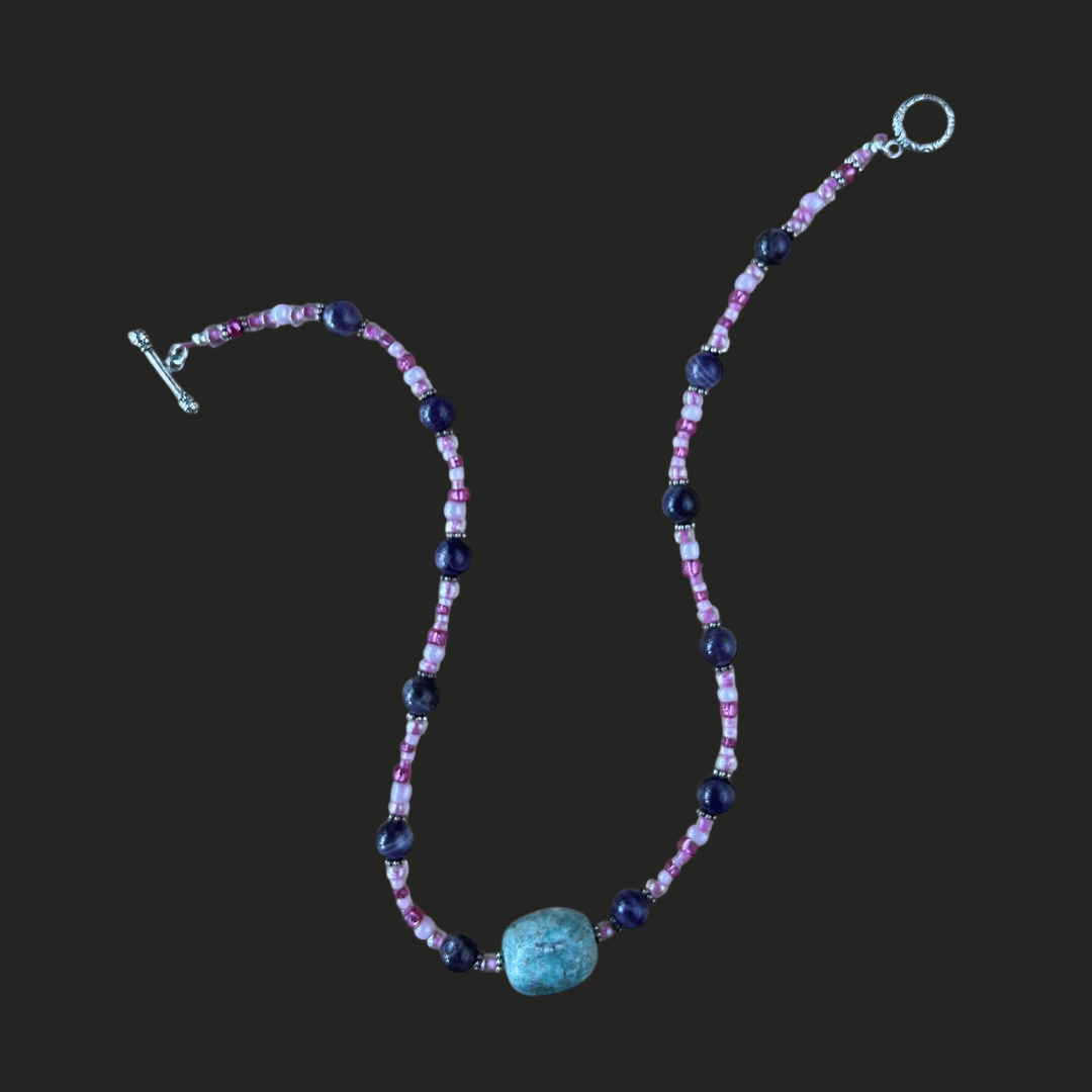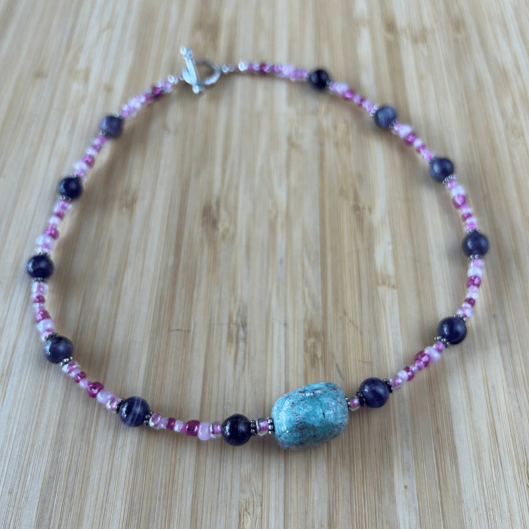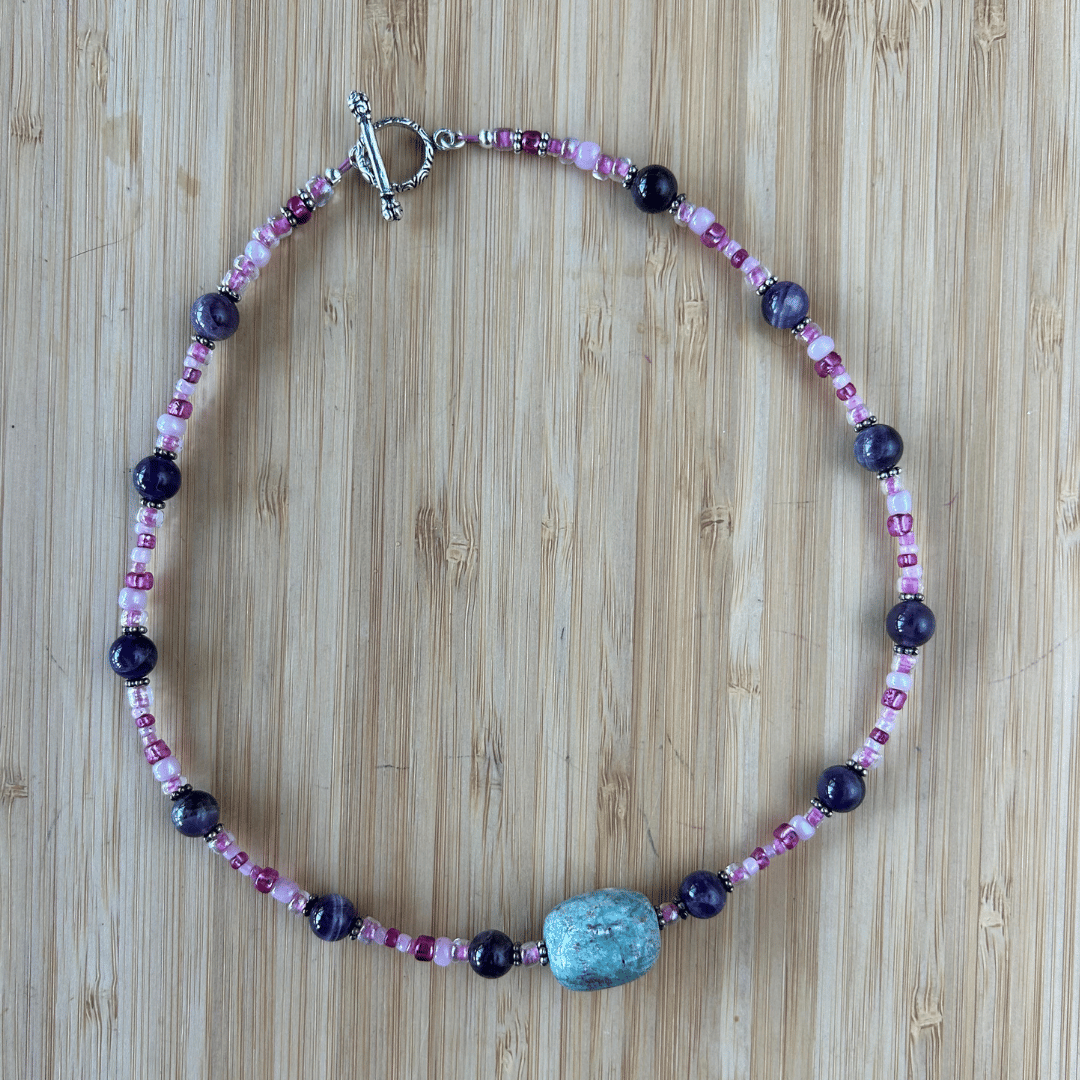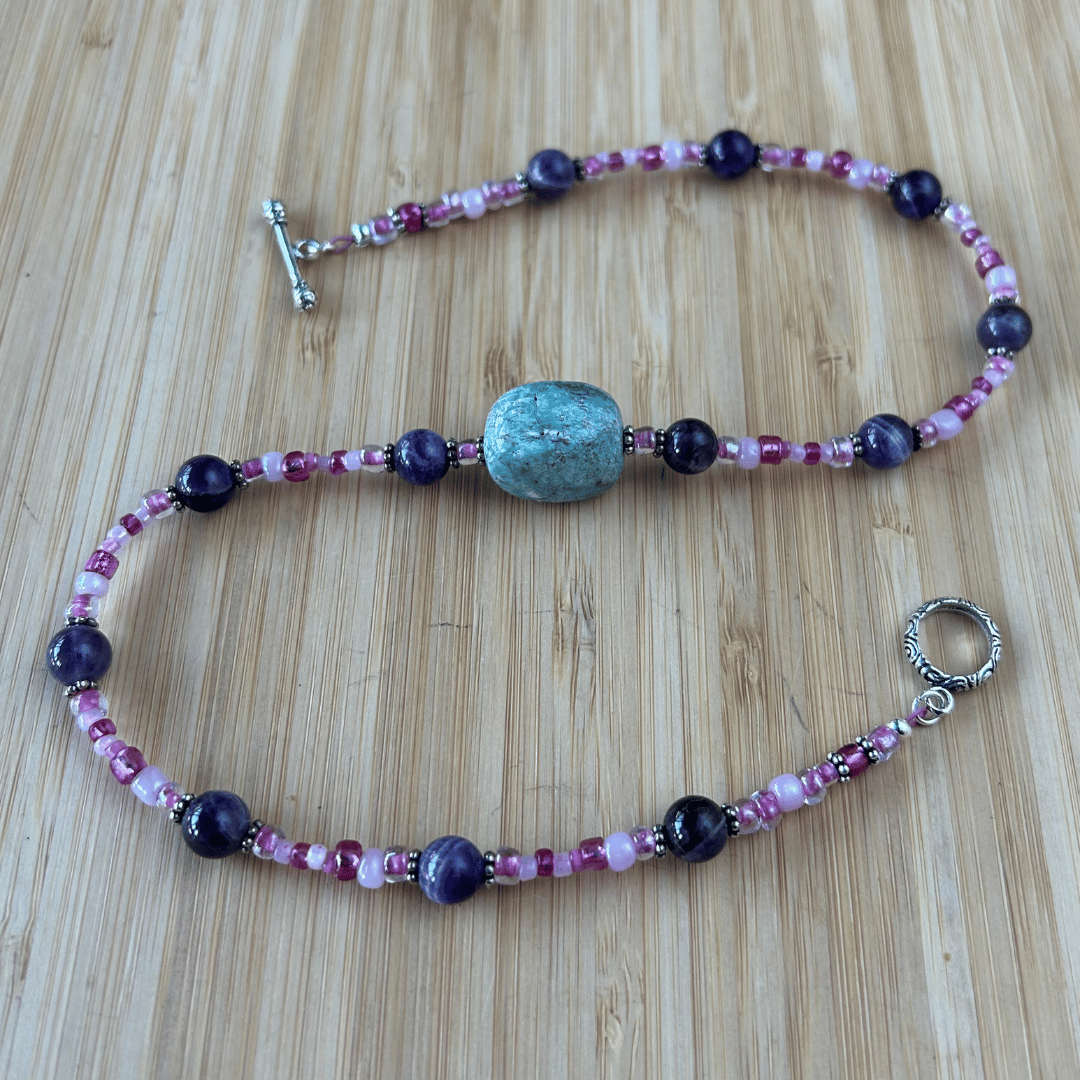 📿 Simply Strung Amethyst, Colored Glass, Amazonite Pendant, Silver Plated Clasp